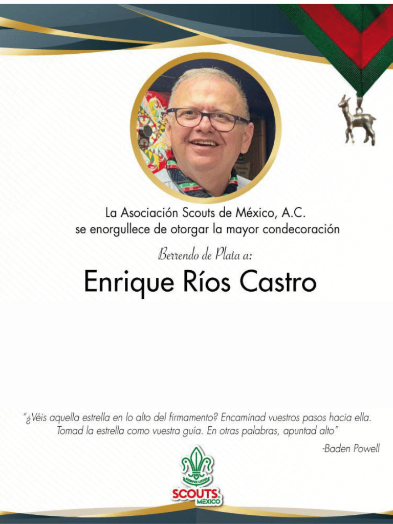 En una emotiva ceremonia que reunió a la familia scout de la región, el Padre Enrique Ríos Castro fue distinguido con el Berrendo de Plata, la máxima condecoración nacional otorgada por la Asociación de Scouts de México, A.C. (ASMAC) a quienes demuestran un servicio y liderazgo fuera de lo común.