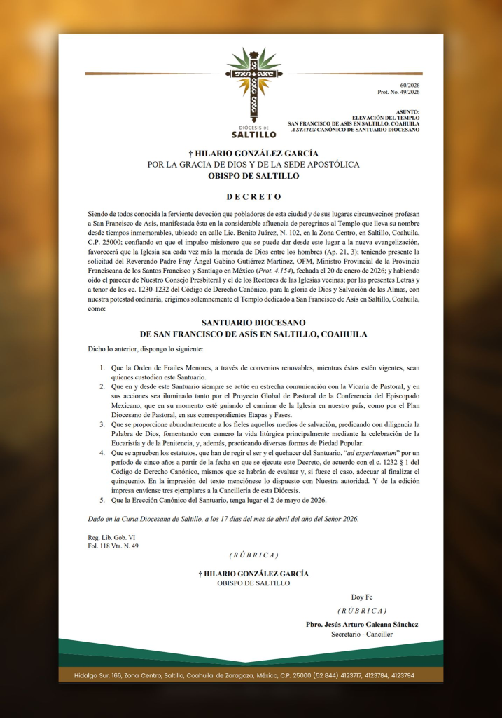 La Diócesis de Saltillo ha anunciado oficialmente la erección del Templo de San Francisco de Asís como Santuario Diocesano, reconociendo así la profunda y arraigada devoción que durante generaciones han manifestado los fieles de la ciudad y de comunidades cercanas.